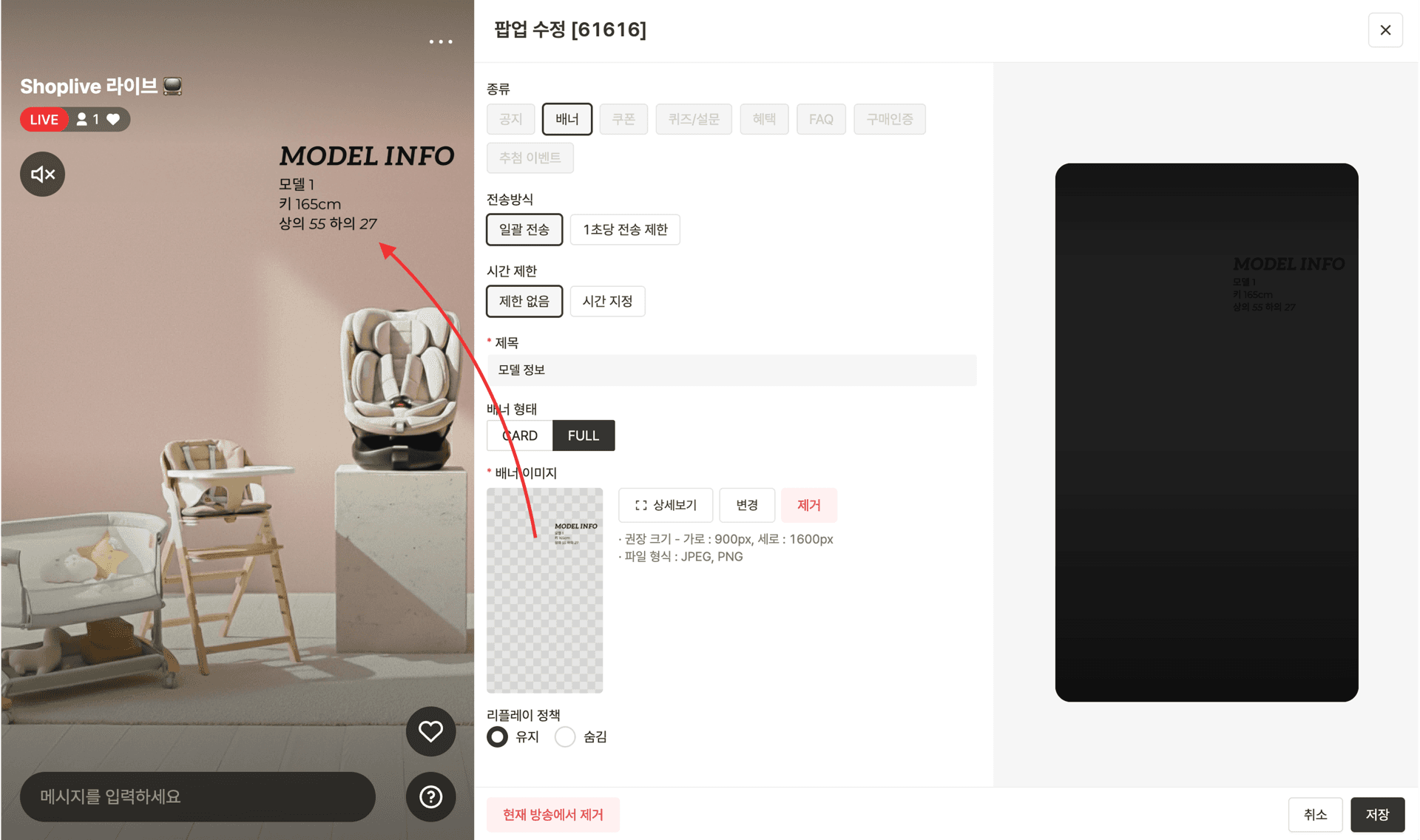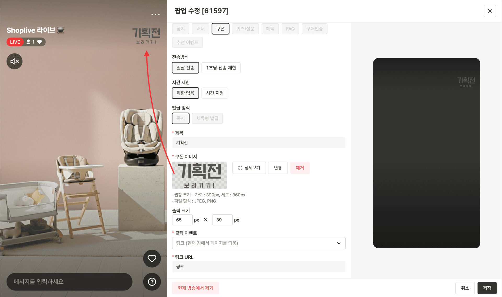 라이브 방송 중의 팝업 기능은 라이브 화면 위에 정보를 노출하고,