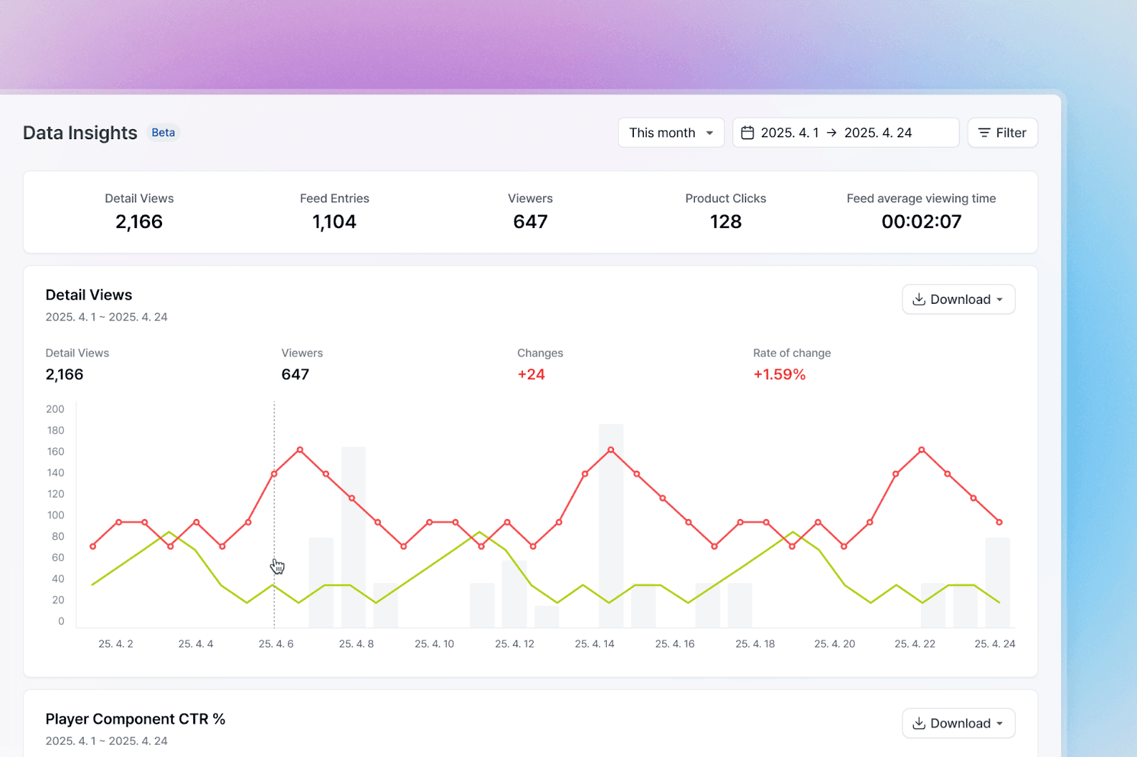 ‘SNS에서 가져오기’ 기능과 샵라이브의 ‘데이터 인사이트’를 함께 활용하면 각 콘텐츠의 조회수·클릭률·전환율을 한눈에 보며 어떤 콘텐츠가 어떤 반응을, 얼마나 이끌어냈는지 명확하게 분석할 수 있습니다.